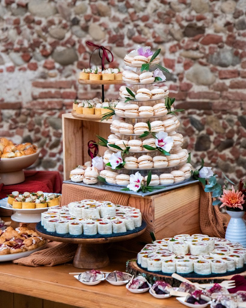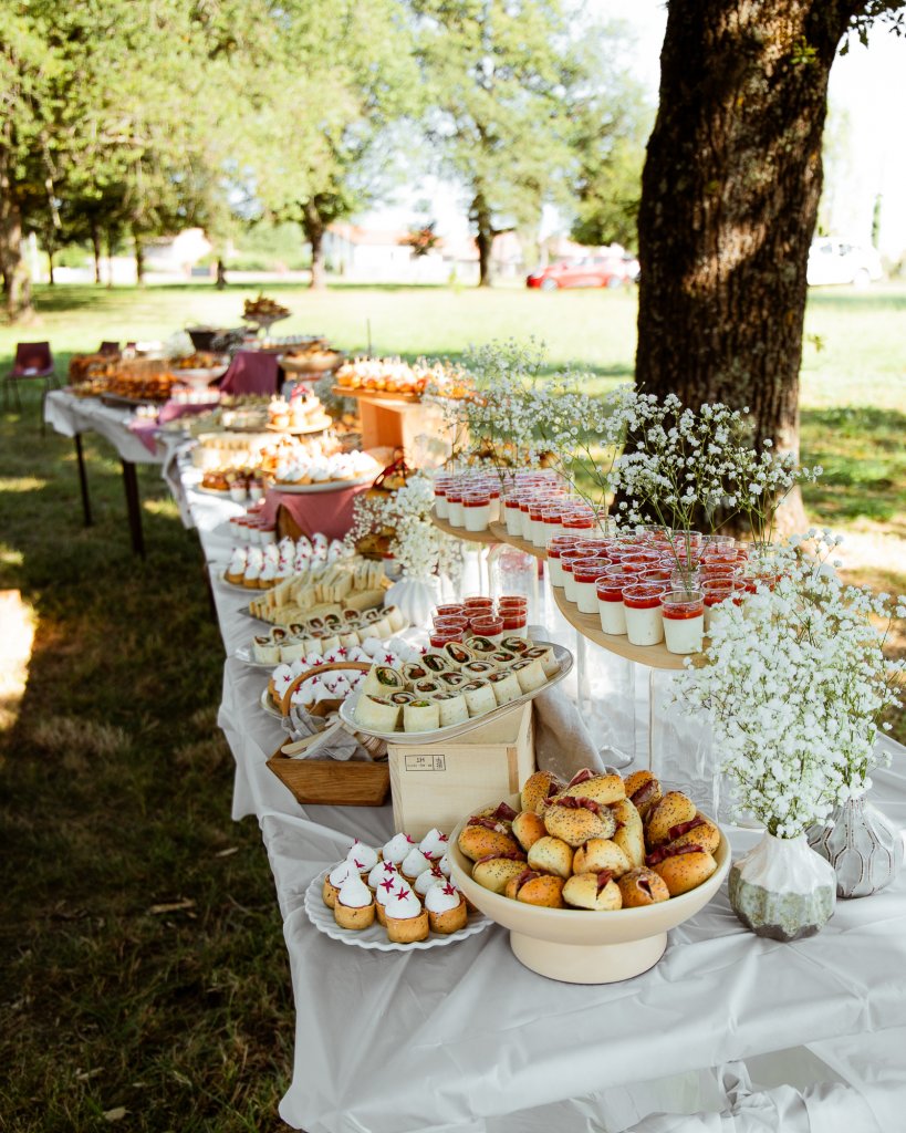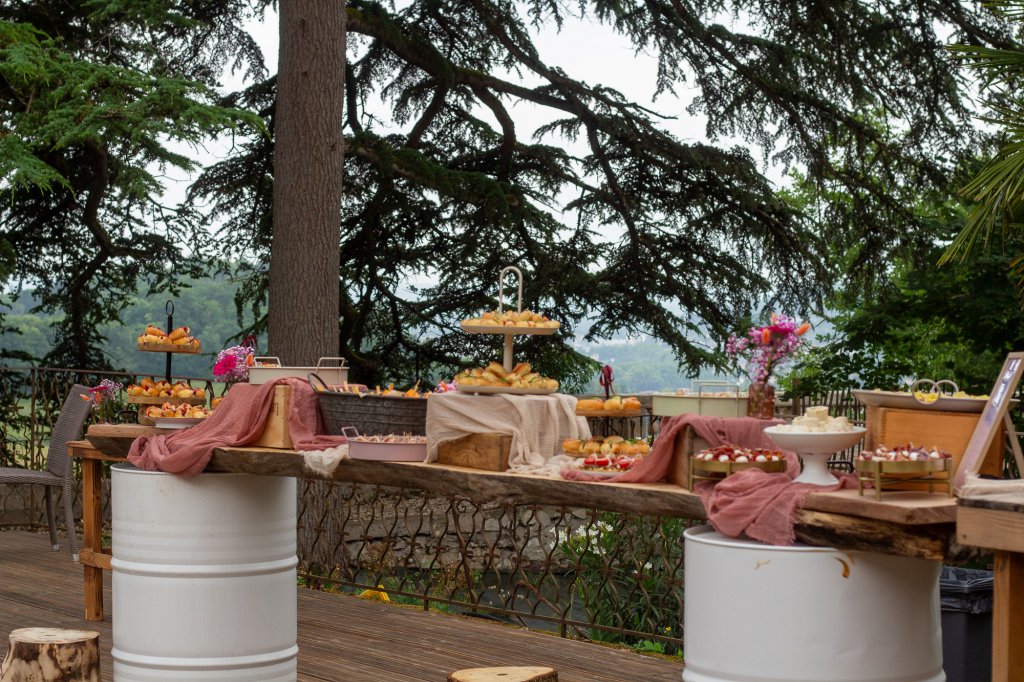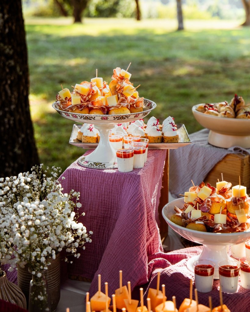Les buffets salés, pièces sucrées et desserts personnalisés sont pensés pour s’harmoniser avec l’esthétique générale de la fête et mettre en valeur les moments forts.