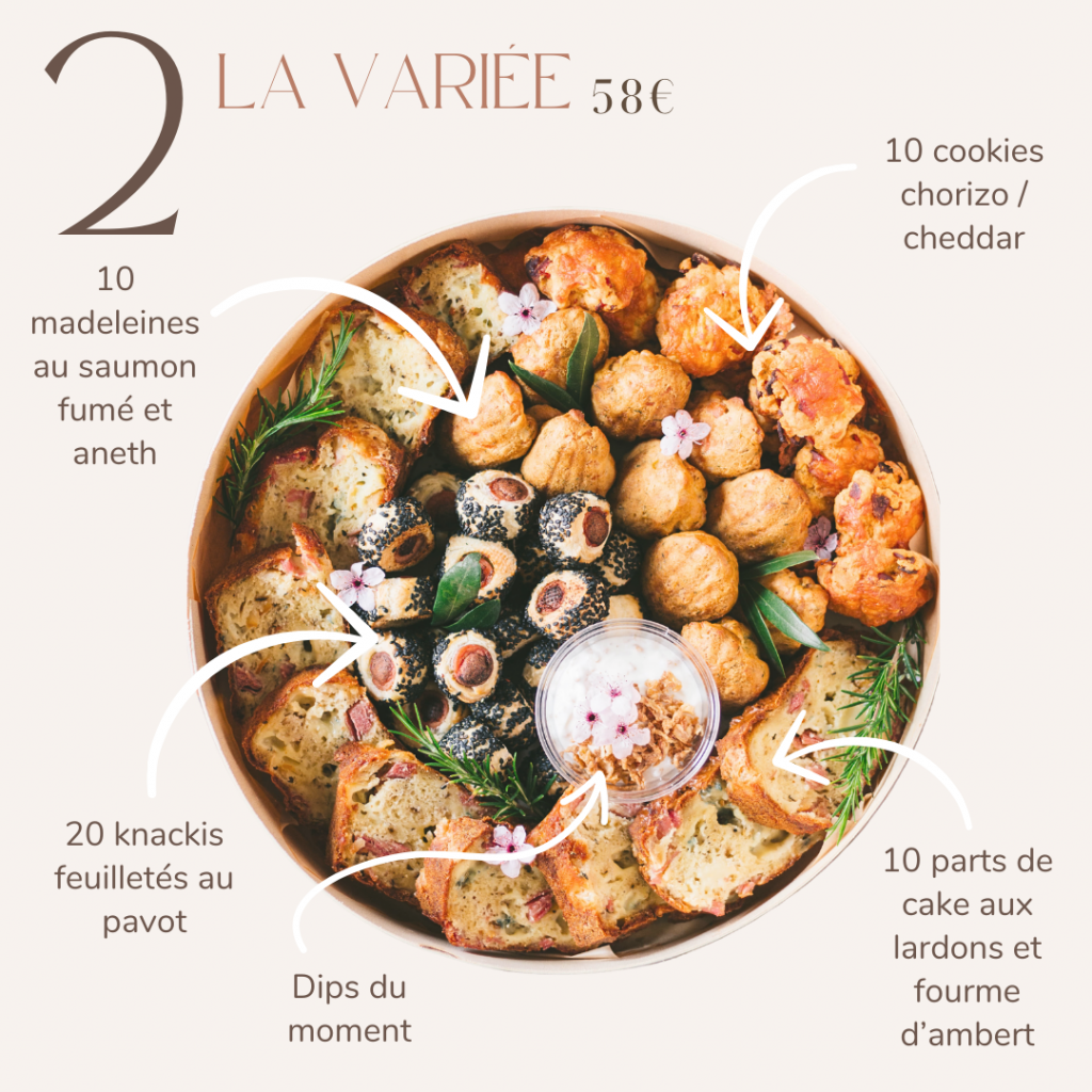 La Végé et La Variée proposent des assortiments salés complets, composés de bouchées artisanales faites maison : cakes, madeleines salées, feuilletés, sablés et accompagnements du moment. Des box généreuses, idéales pour un apéritif, un brunch ou un repas convivial.