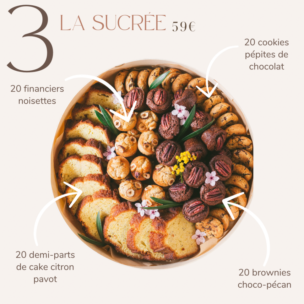 La Sucrée réunit une sélection de douceurs maison : financiers, brownies, cookies et autres gourmandises, parfaites pour conclure un repas, accompagner un café ou partager un moment sucré.