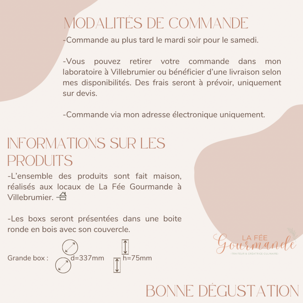 Les box et plateaux de La Fée Gourmande offrent une manière généreuse et pratique de partager un moment gourmand, que ce soit pour un apéritif dinatoire, un brunch ou une occasion particulière.